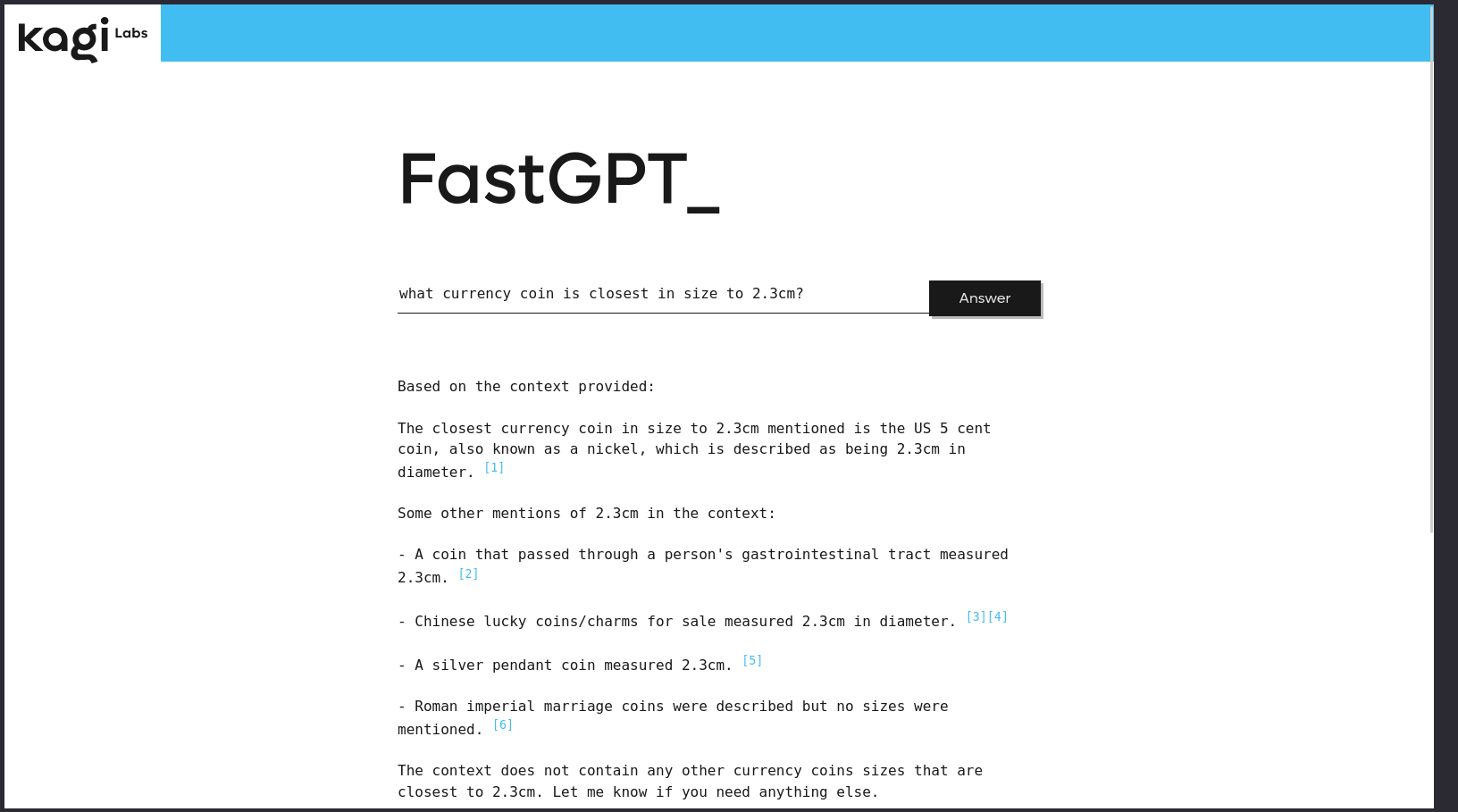 For example, when I use the prompt on FastGPT of "what coin is closet in size to 2.3cm?", I get accurate results for what I am looking for despite using the wrong word. Context of this is that I am trying to determine what coin a kid swallowed on an xray of the chest.
