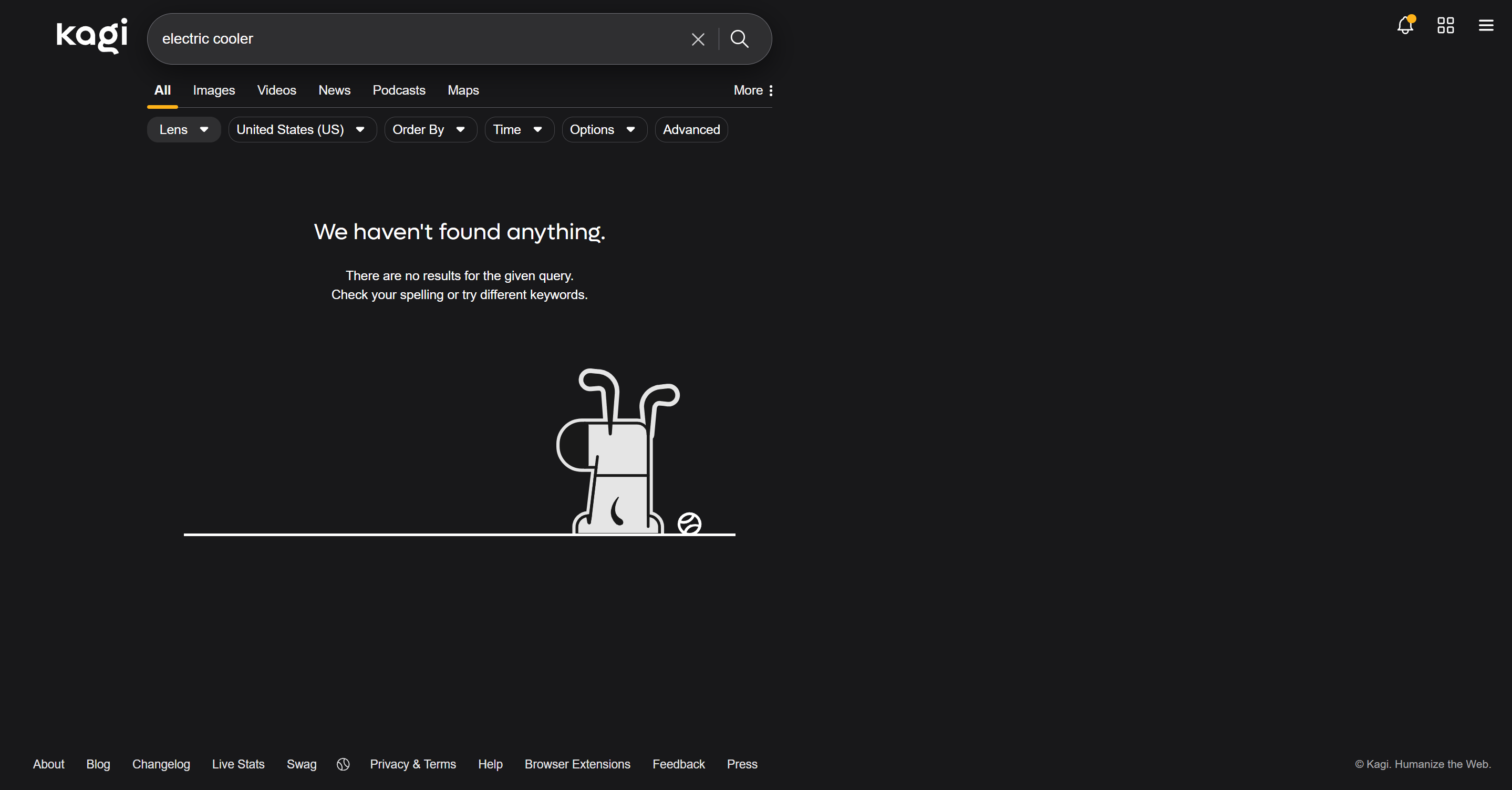 Observe that Kagi shows a “We haven't found anything” message and does not display any search results or suggestions.