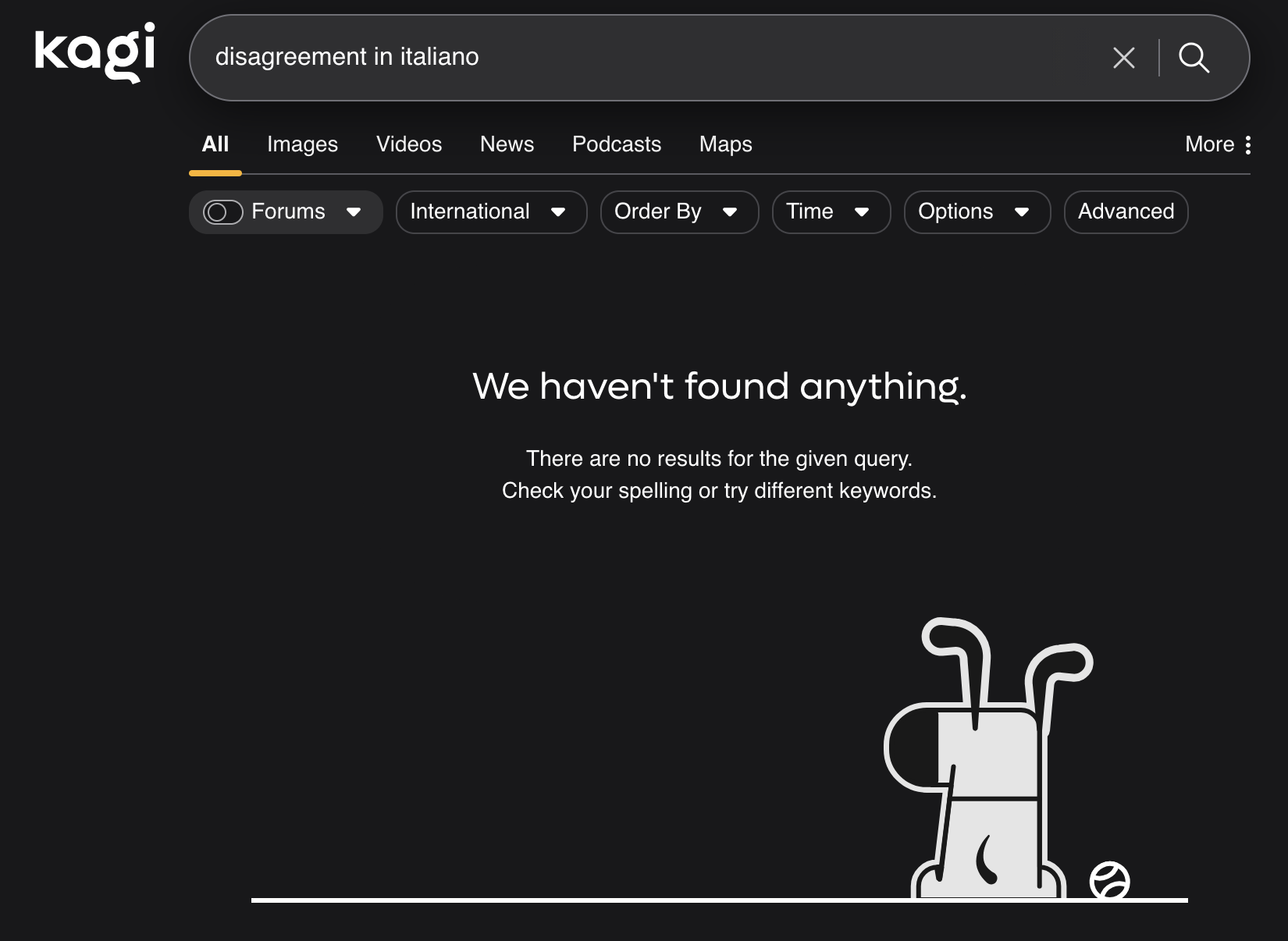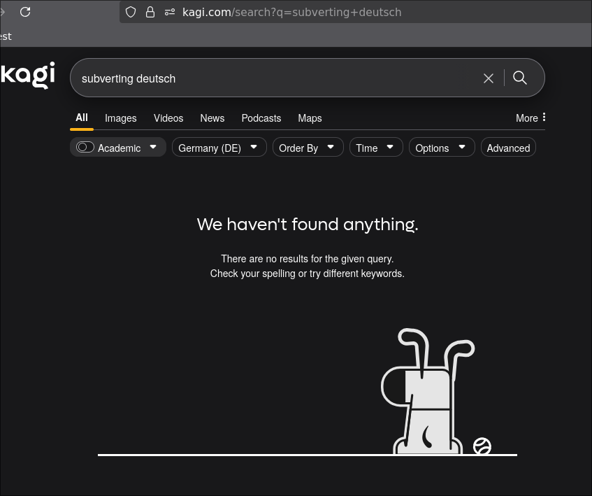 When I searched for subverting deutsch on Kagi, the search returned a “We haven't found anything” page with no results, suggestions, or related queries.