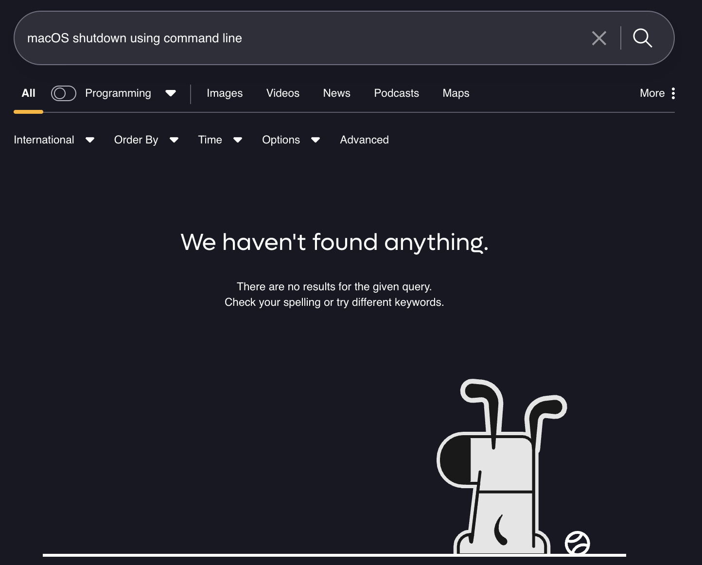 This morning, I searched on Kagi for how to shutdown a mac using the command line. So I searched for "macOS shutdown using command line". Nothing came up: