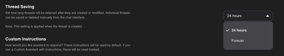The "Thread Saving" option controls how longs threads are kept if not pinned in the new Kagi Assistant UI.