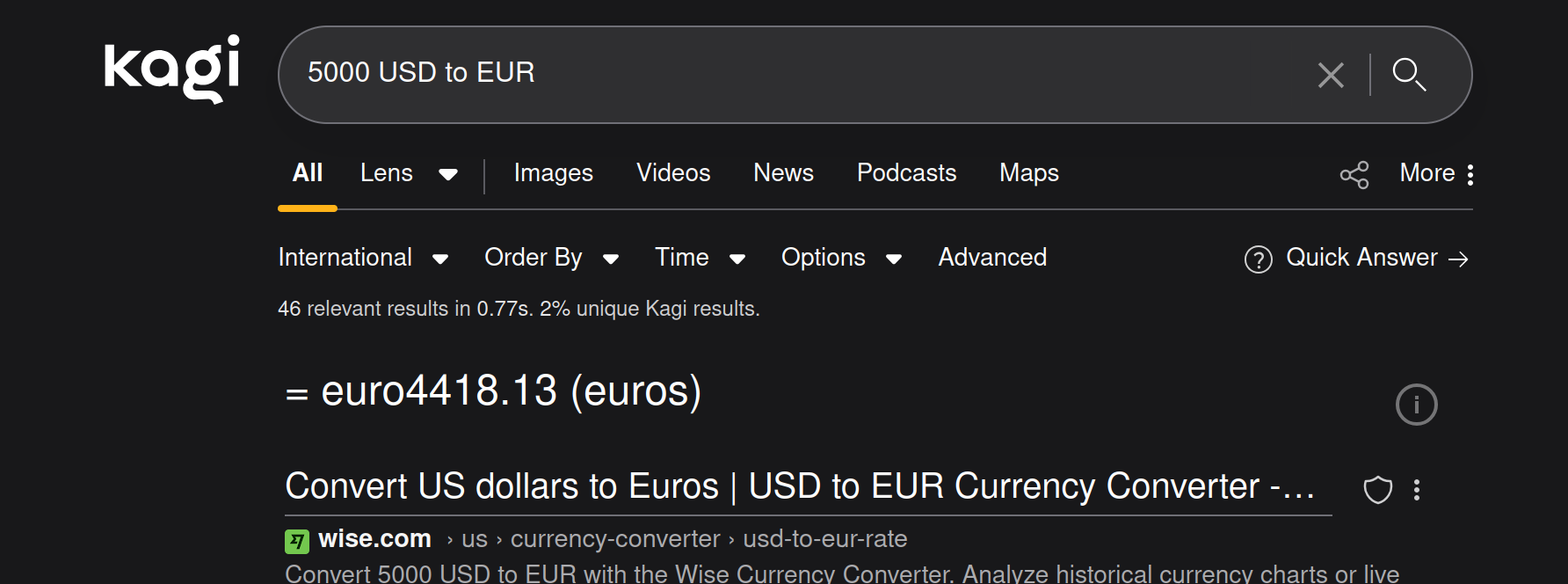 kayo Hey very minor text bug When using Kagi for a currency conversion, it shows the wrong "symbol". Example search: https://kagi.com/search?q=112233+francs+in+euro Have a €-symbol like the $-symbol when trying i.e. 112233 francs in usd