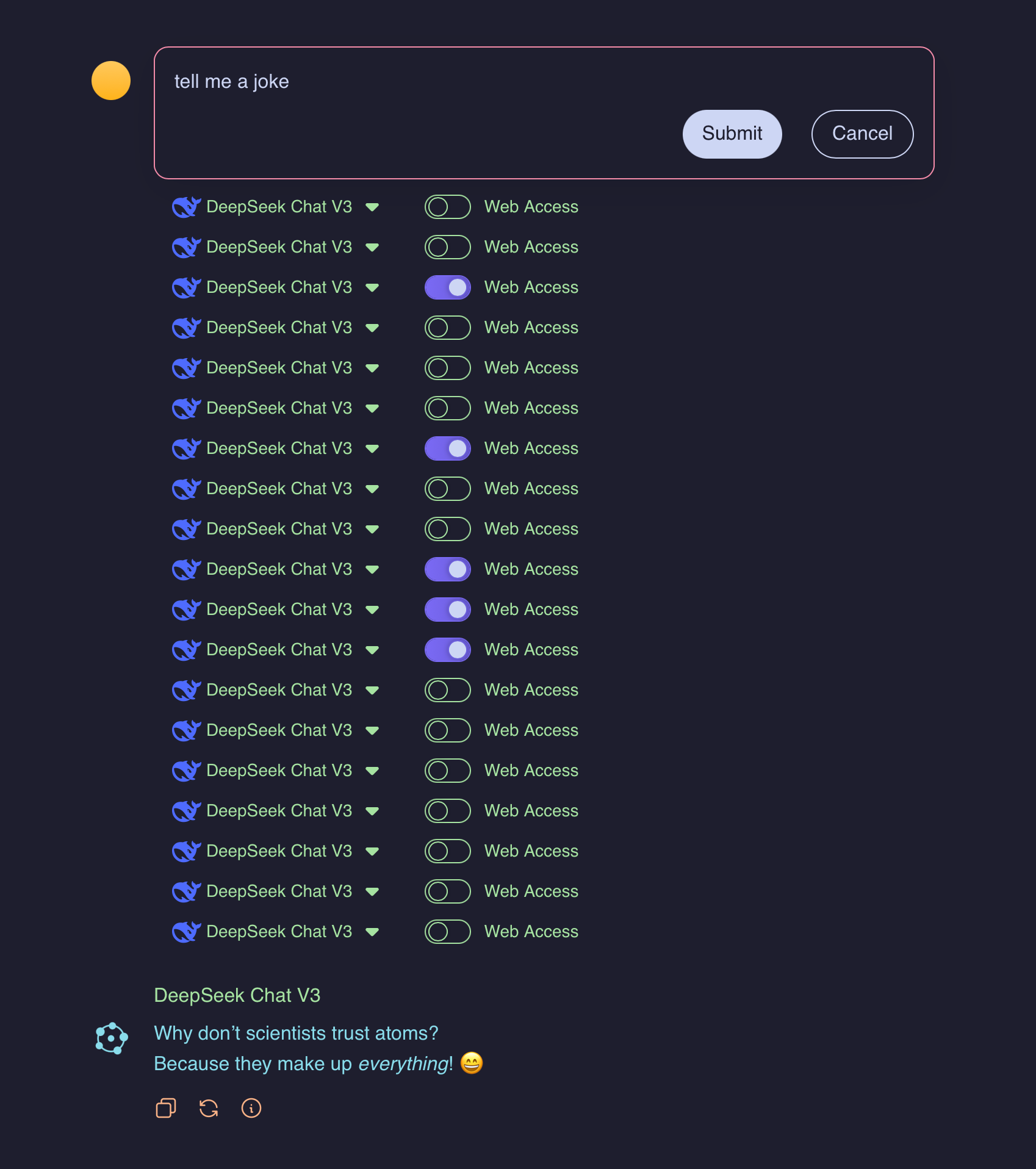 The bug seems to be visual only as submitting the prompt works just fine. The LLM selection is applied based on the first instance of the toggle.