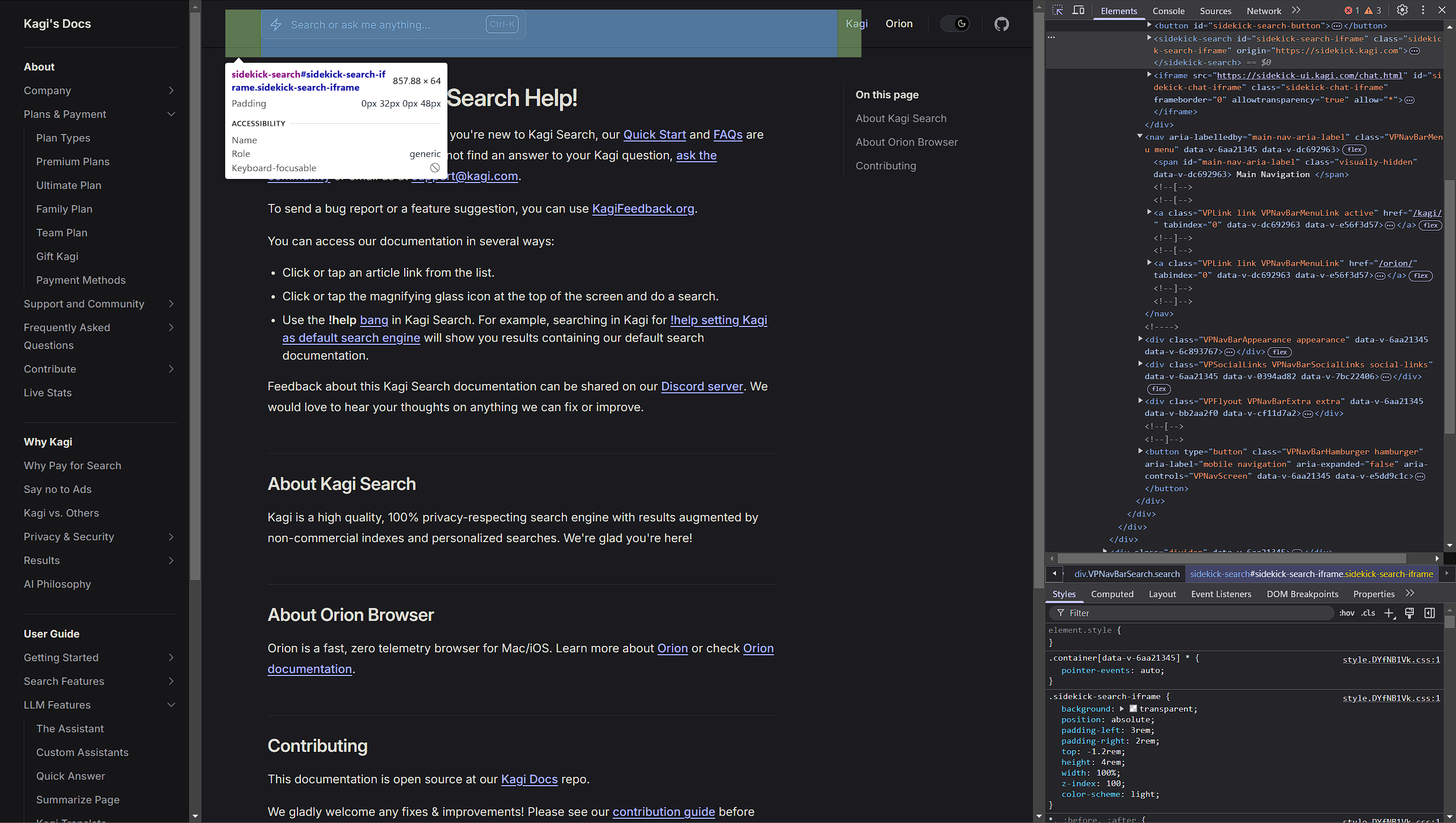 In the header, the interaction zone of "Kagi" is only the right half, the left half seems to have a lower z-index than the sidekick-search element, making it not interactive on mouseover