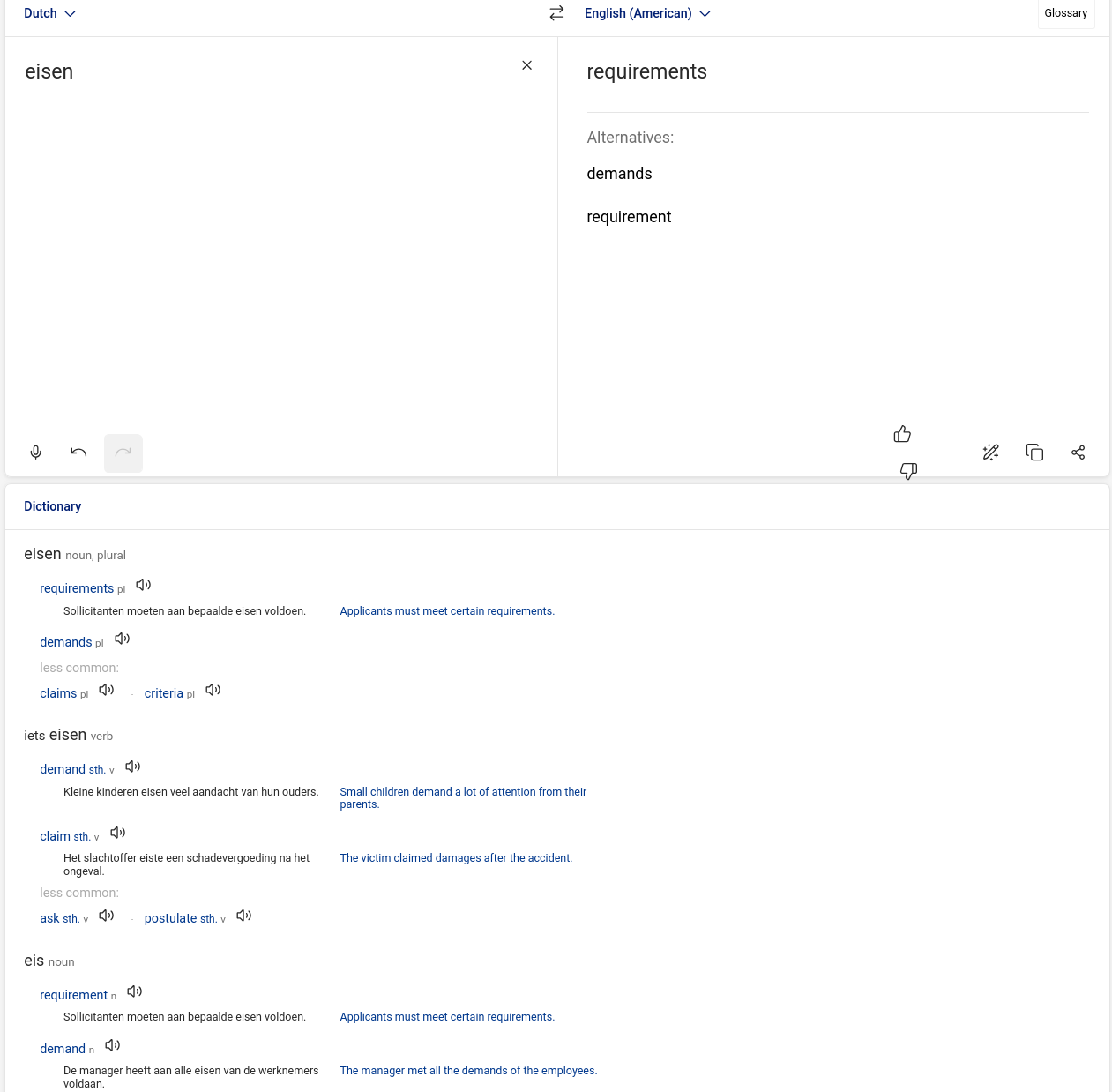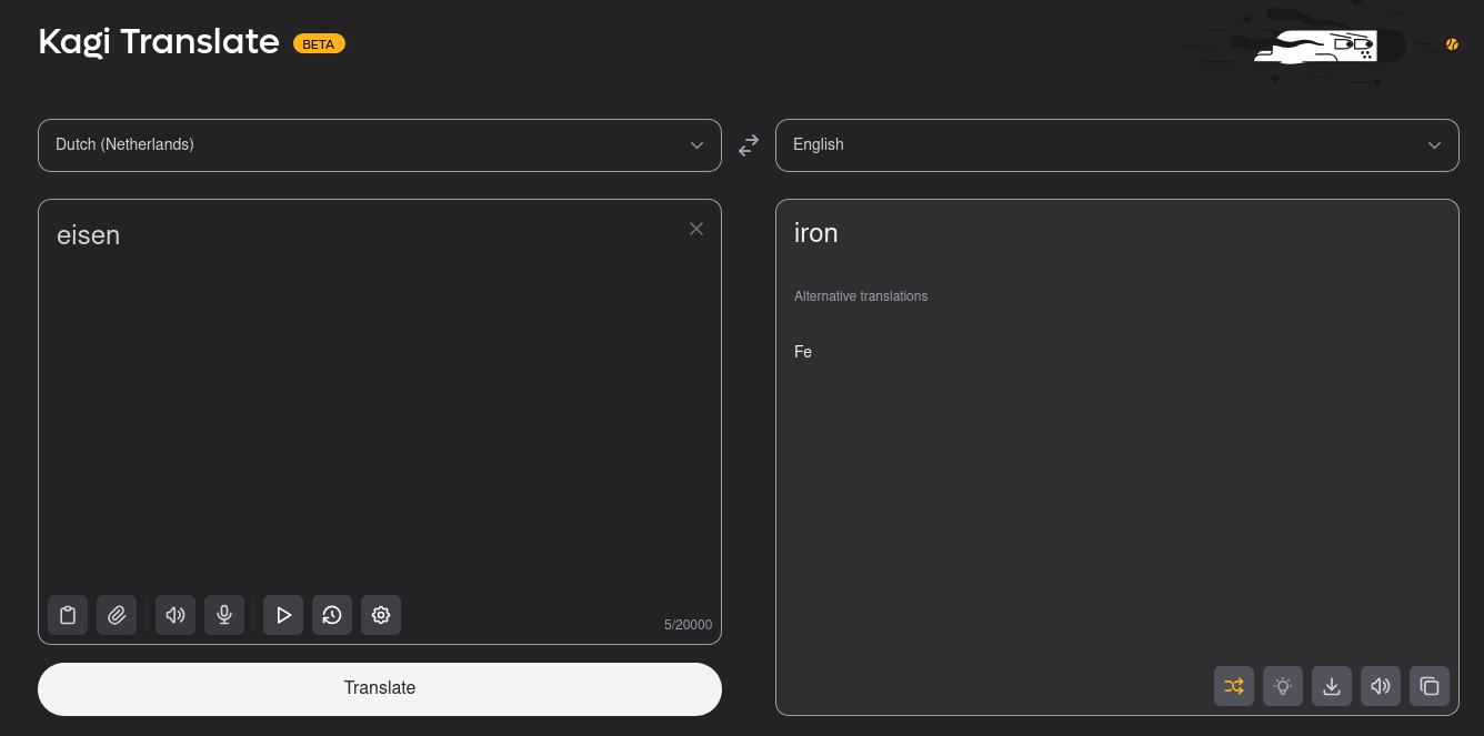 Mat00 https://translate.kagi.com/?from=nl_nl&to=en&text=eisen This translation is very odd, this is the Dutch word for requirements/demands/claims, and has nothing to do with Iron. The Dutch word for Iron is IJzer. The German word for Iron is Eisen. https://www.deepl.com/en/translator#nl/en-us/eisen gives good translations Kagi Translate should understand that German and Dutch are separate languages, and not translate the input as if it was German. Both the nl_nl and nl input languages are affected, though nl_be works fine.