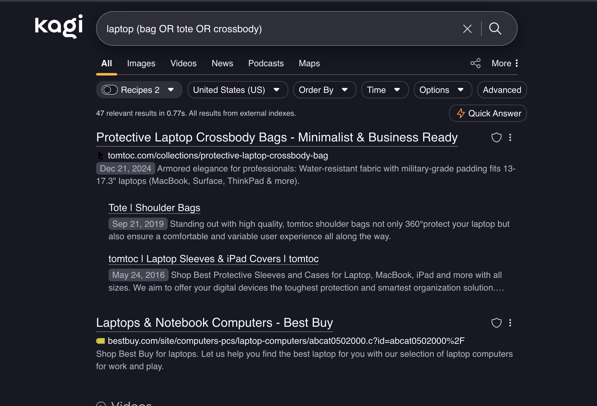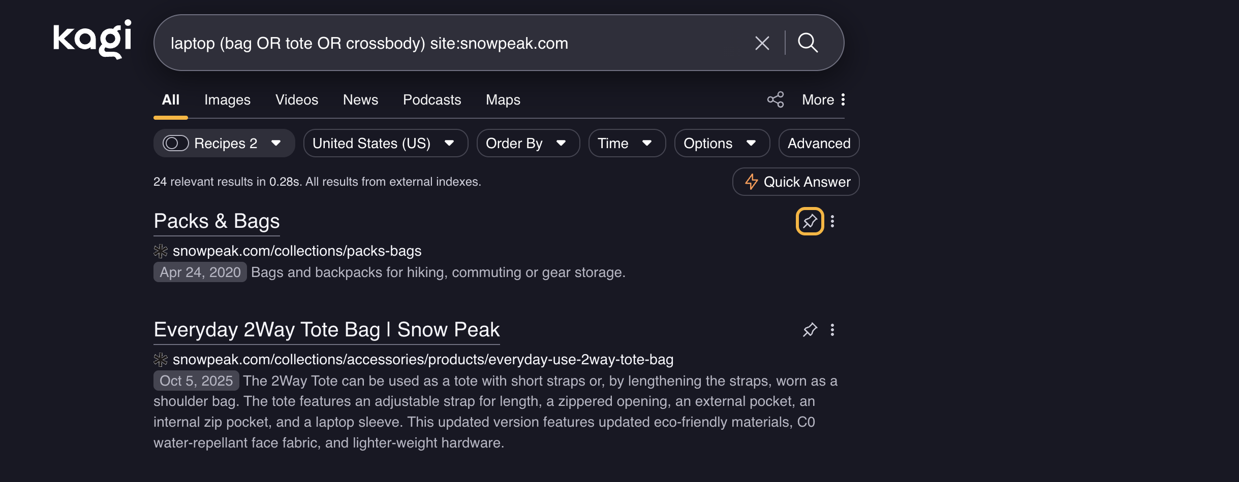 I’ve noticed that recently my pinned and preferred domains are showing up less and less often when attempting to search for things. For example, I recently ran the search “mens Laptop Bag OR Tote OR crossbody”. I have many online stores pinned that I’m confident have results that would match this. However, my top results ended up being just about the same as any other search engine. Has something changed?