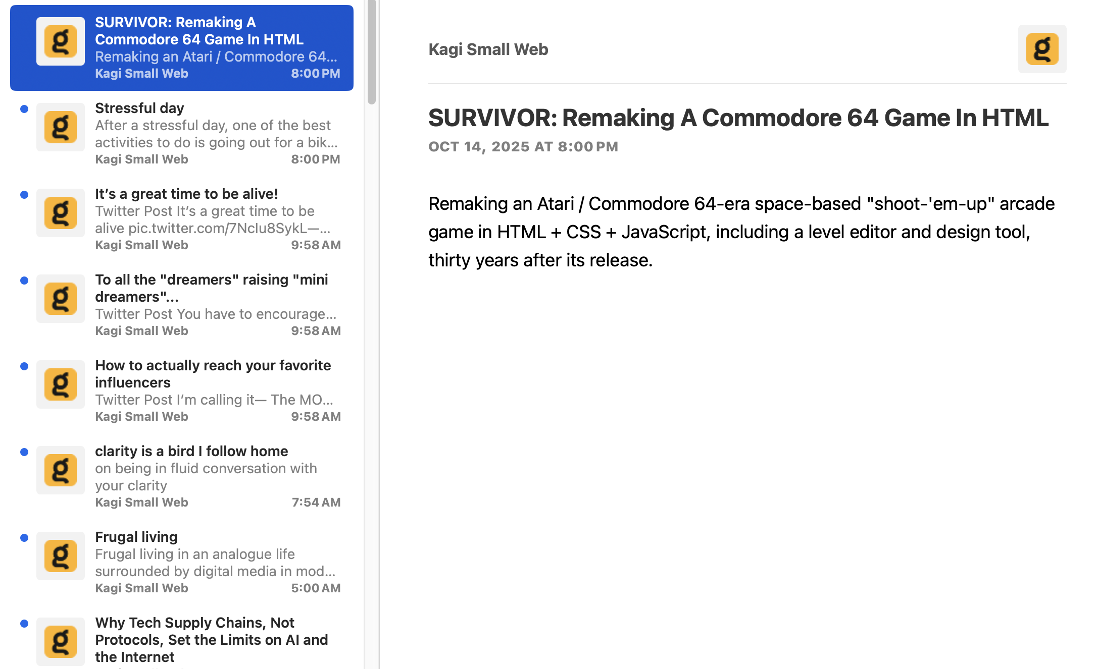 As an avid RSS user, I’m keen on discovering more of the amazing Small Web via RSS. Unfortunate the main feed is just headlines, with no summary or text about the content. It is a pretty useless feed other than alerting me to an article. But it is hard to know what an article is about from the title alone.