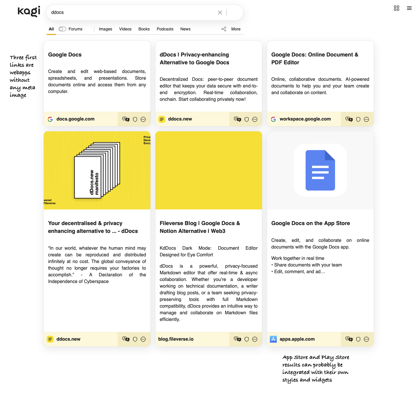 In the examples I have limited the results to 6, so that it's not too slow for Kagi to retrieve. There can be a button to load the next 6 or 9 results. It shouldn't be any problem for Kagis crawler to get the text, images and more from the results, using meta data and the readability script. For incompatible sites, just leave the search result description coming from your upstream search providers.