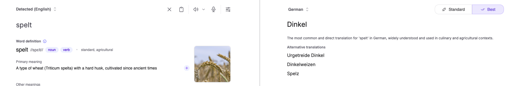I can imagine now how it works behind the scenes: For "Standard" maybe you do the translation already asynchronously with just "spelt" as input, while at the same time, concurrently, you fill the left side with the different meanings. For speed as you said. And with "Best" you fill the left side first, and then pass it to the translation, to give it more context. And either you only pass the primary meaning then, or even everything and the model picks up the primary meaning on its own.