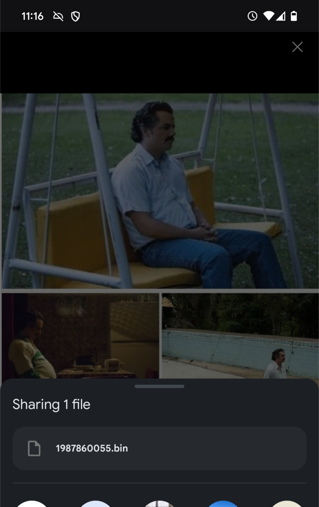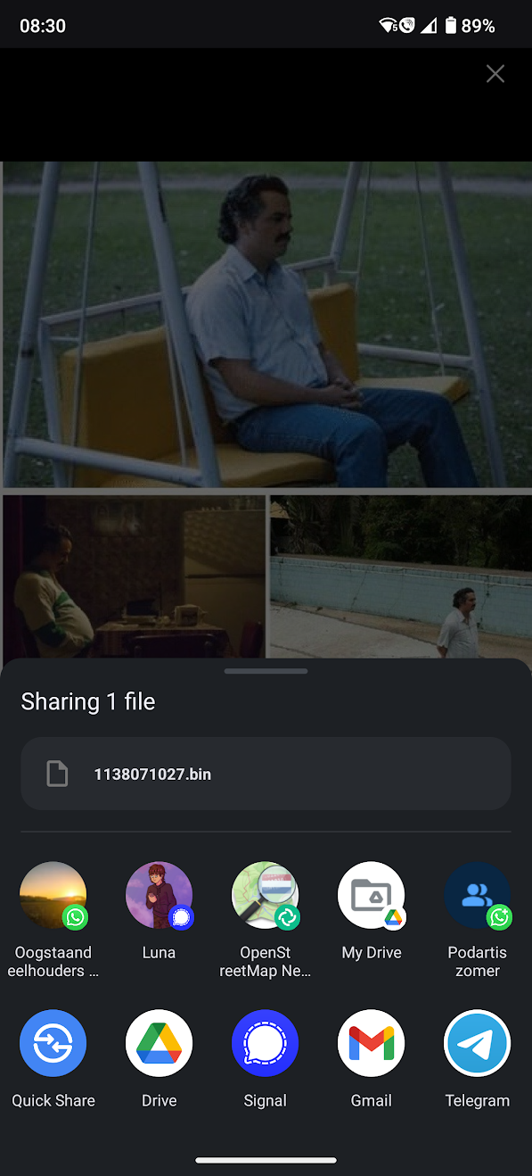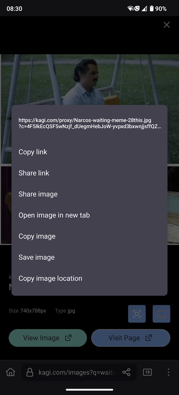 RonanCJ When I found an image in Kagi search results, I tried to share it from Firefox on Android through the Firefox sharing menu. However, my phone told me that I would be sharing a .bin file rather than a normal image. This did not happen for other images. Steps to reproduce: Open Kagi on Firefox on Android Search for "waiting meme" in Kagi Go to the Images tab of the results Tap on the jpg image from imageresizer.com ("Narcos waiting Meme Generator") to preview it Long-press on the image to bring up the Firefox image menu Click Share image See that the file being shared by Android is a .bin file, not an image Close the Android share menu and tap the X to close the preview. Tap on the jpg image from imgflip.com ("Mr bean waiting Meme Generator - Imgflip") to preview it. Repeat Steps 5 and 6 See that the image being shared by Android is indeed an image, as expected. I expected that pressing Share image on a result identified by Kagi as a JPG would let Android share something that was actually an image, rather than a .bin file