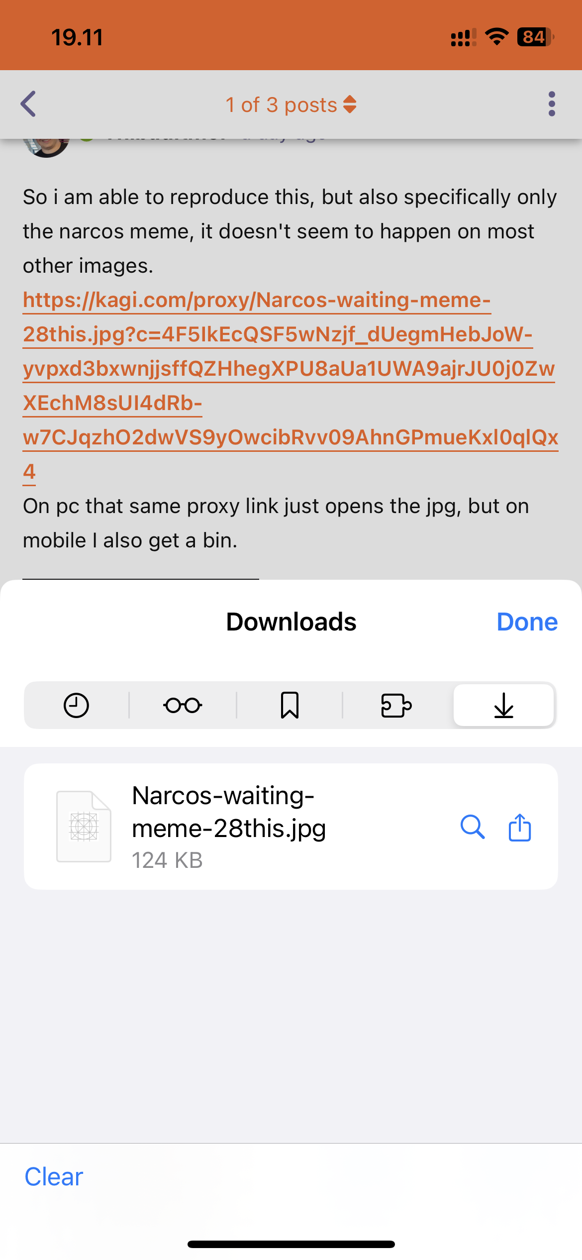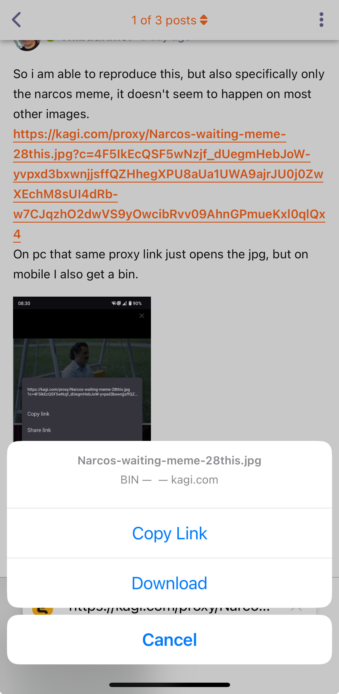 Thibaultmol So i am able to reproduce this, but also specifically only the narcos meme, it doesn't seem to happen on most other images. https://kagi.com/proxy/Narcos-waiting-meme-28this.jpg?c=4F5IkEcQSF5wNzjf_dUegmHebJoW-yvpxd3bxwnjjsffQZHhegXPU8aUa1UWA9ajrJU0j0ZwXEchM8sUI4dRb-w7CJqzhO2dwVS9yOwcibRvv09AhnGPmueKxl0qlQx4 On pc that same proxy link just opens the jpg, but on mobile I also get a bin.