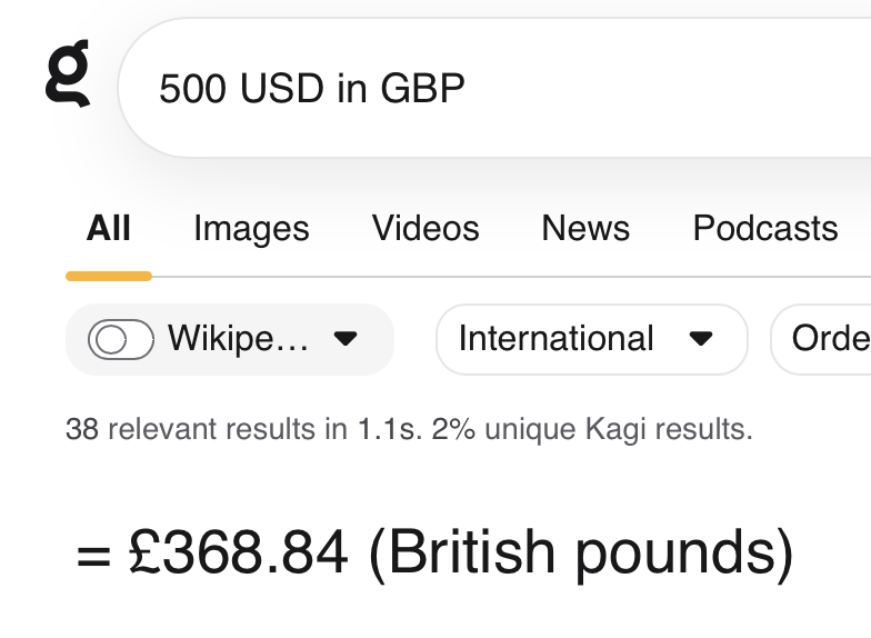 One of my favourite features of Google is the currency conversion. Just put in the amount (e.g. ¥28,000), and it gives you the correct amount in your local currency, with a graph of the currency’s performance, etc. I would love this feature on Kagi; it’s one of the few features I miss from Google and it would help speed up my day by that little bit more. Apart from that, I love the product. Great job, everyone!