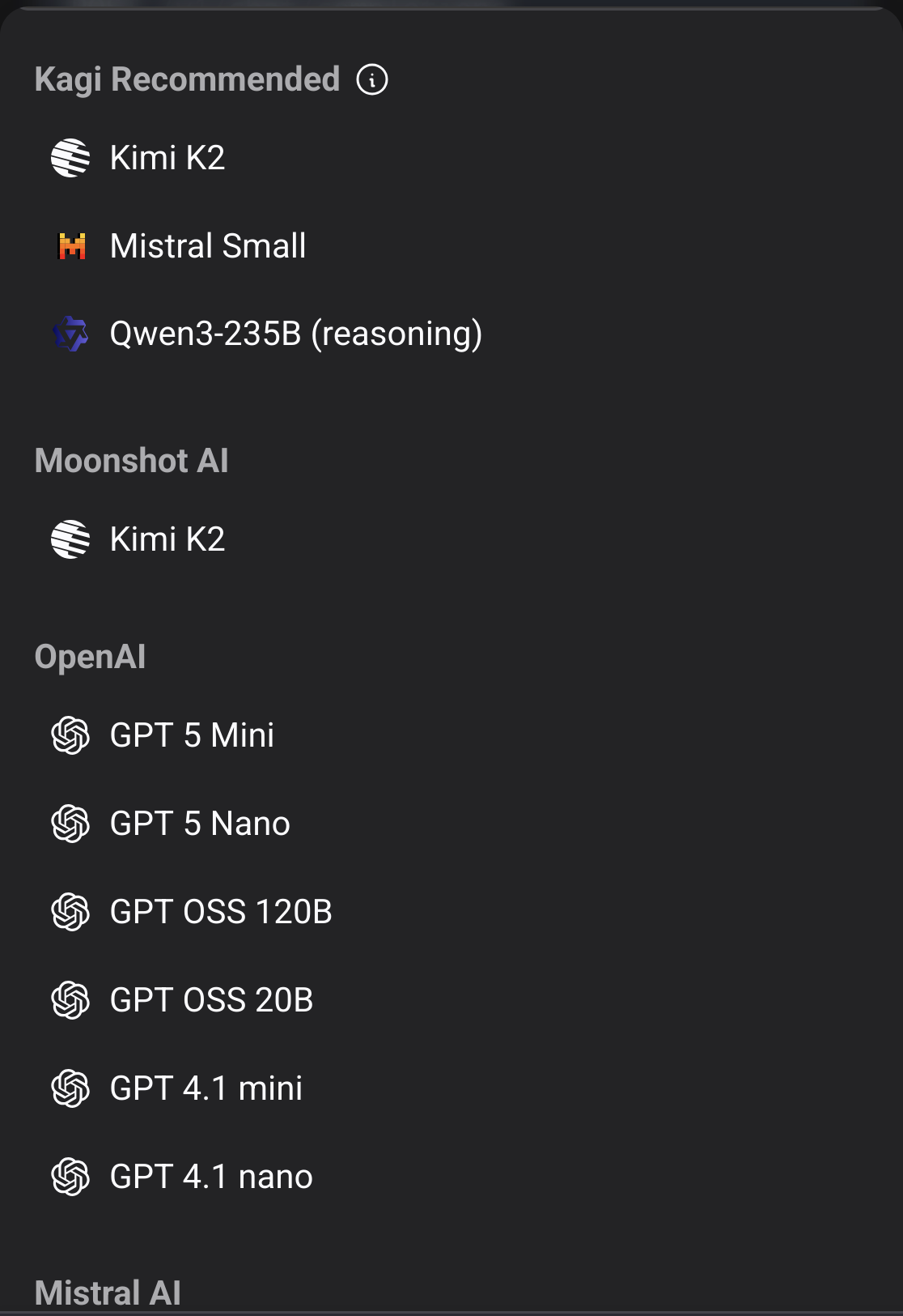 krincner I just noticed that the main page for the assistant is outdated, missing gpt-5 variants and glm 4.5 for example https://help.kagi.com/kagi/ai/assistant.html#llms-available-in-the-assistant The page should list all availbe models.