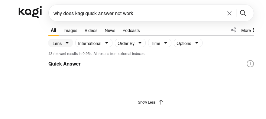 turion Since a few days, Quick Answer doesn't work for me anymore. When I enable the browser console in developer tools, I see that a request to https://kagi.com/_s/quick_answer?q=svg2pdf is launched, but it returns a 404. It should work