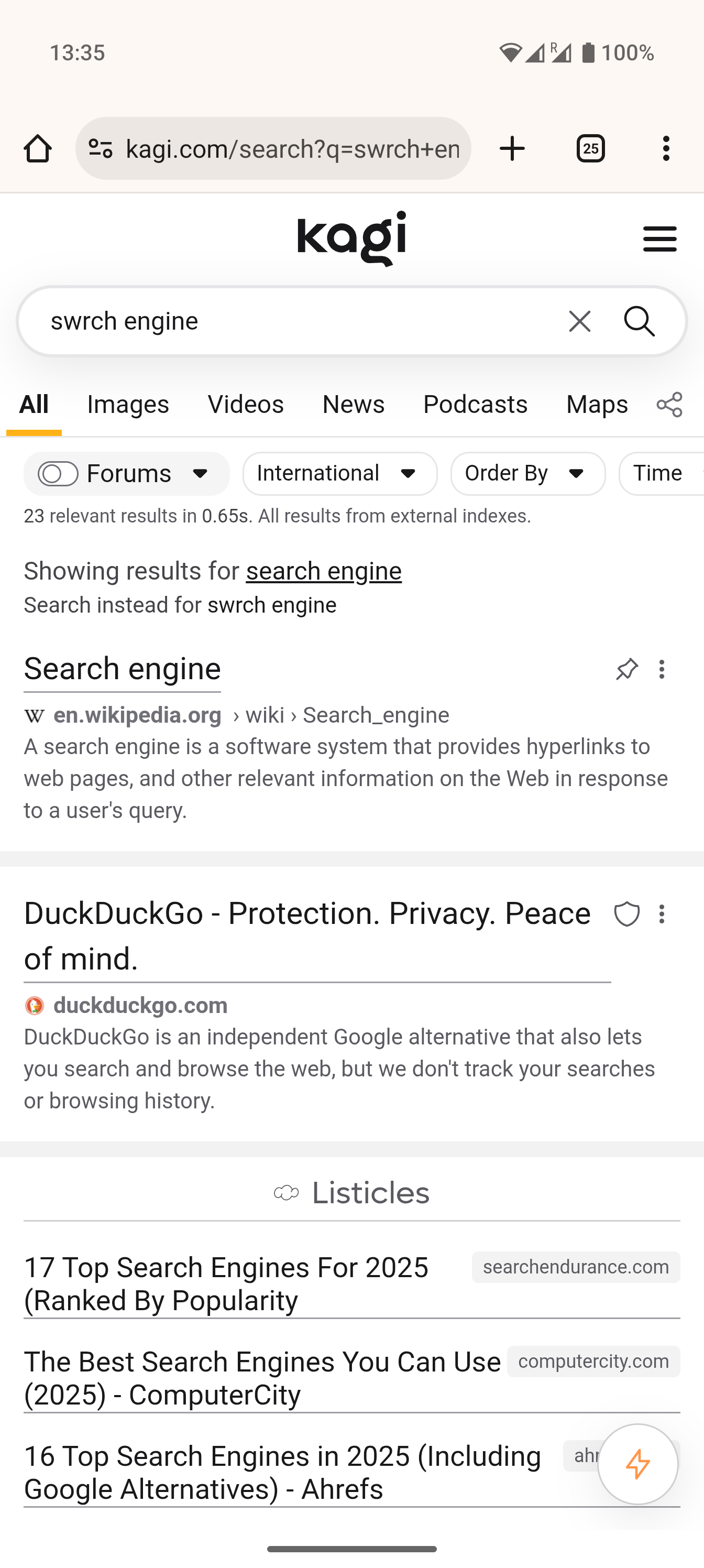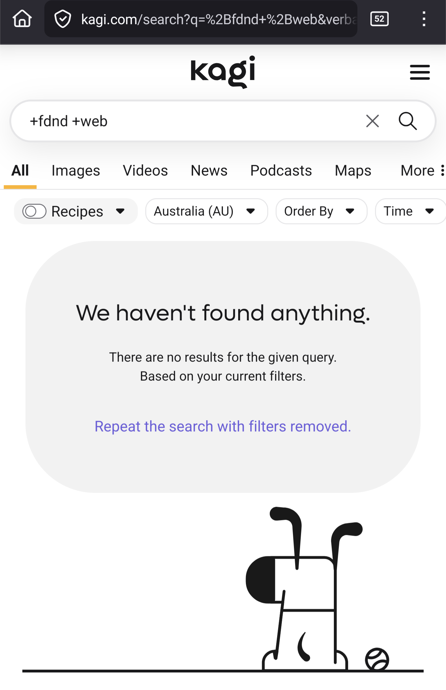 I searched for "fdnd web", hoping to find https://github.com/fdnd, but Kagi assumed I meant "dnd web" and found a bunch of pages about the "web" spell. Google starts its results with "These are results for dnd web; Search instead for fdnd web" to let me correct that mistake, but I don't see a similar button in Kagi.