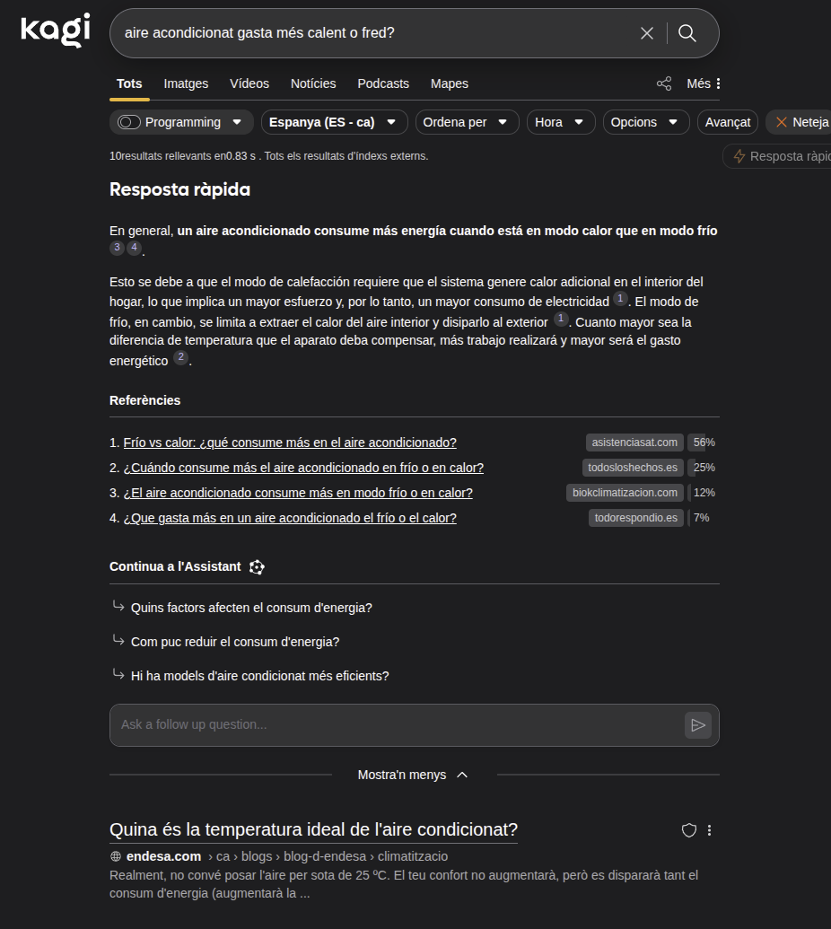 I wrote a search text in catalan, but the quick answer came out in spanish. This happens regardless of the region selected.