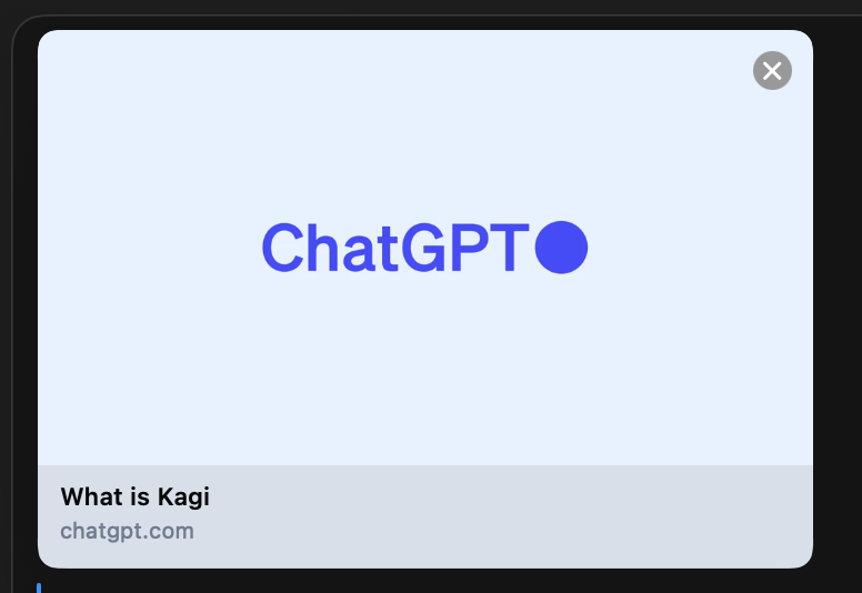 When sharing URLs in messaging apps, oftentimes a preview of the link is rendered with a specific page title and sometimes even a preview of the page content. However, when sharing a link to a public Kagi assistant chat in macOS’s Messages.app, the link is just rendered as “Kagi assistant” with no information about the content of the chat.