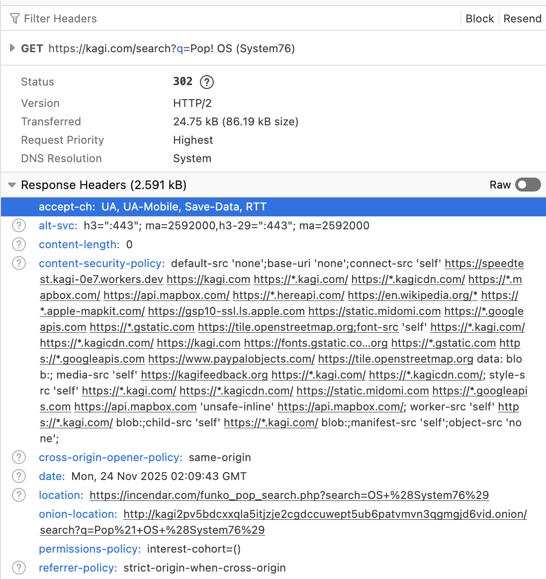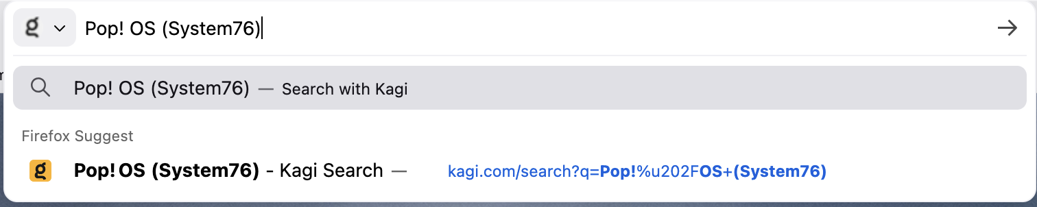 The GET request is: 'https://kagi.com/search?q=Pop! OS (System76)'