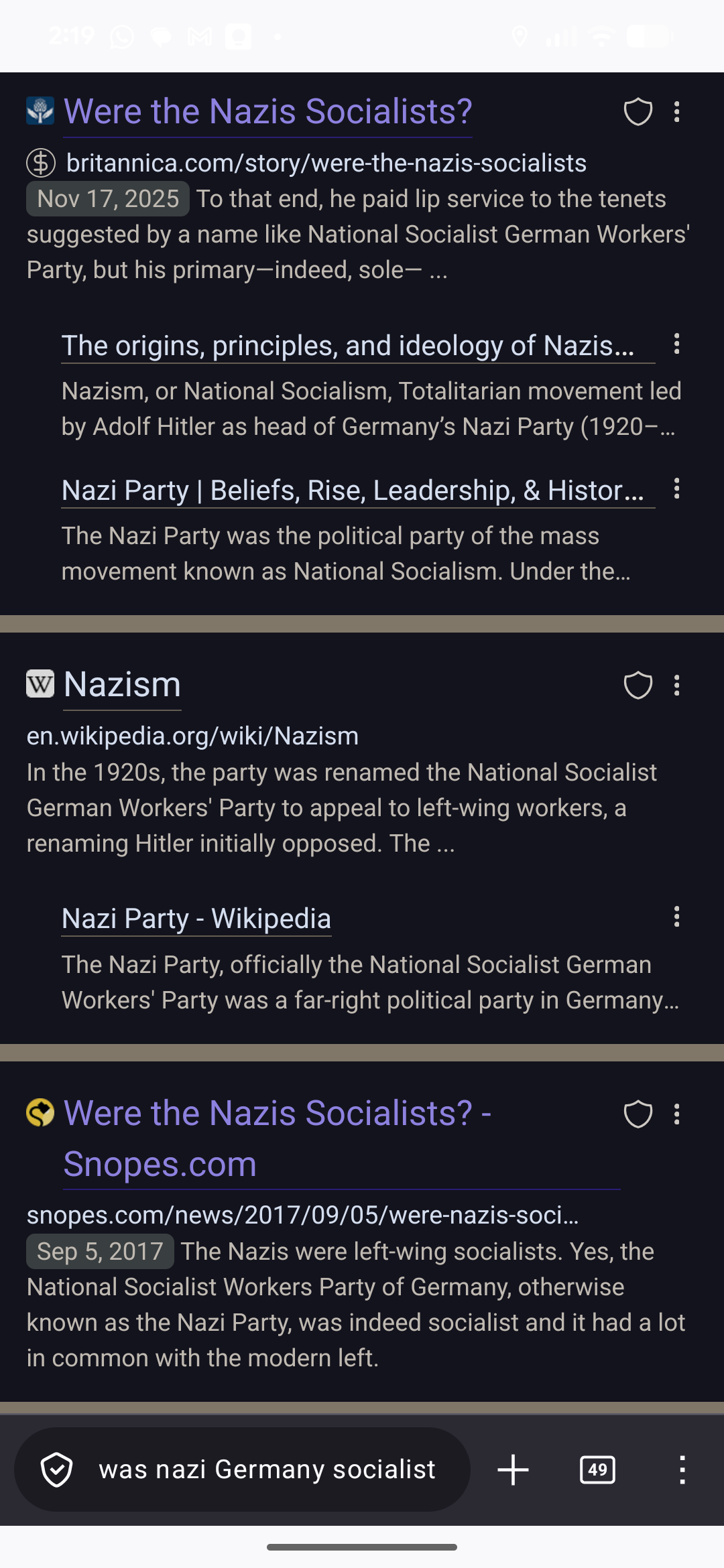 When you search for a query that has a Snopes.com search result (ex. "was nazi Germany socialist"), the result has a text excerpt that is often the opposite of what the article actually concludes.