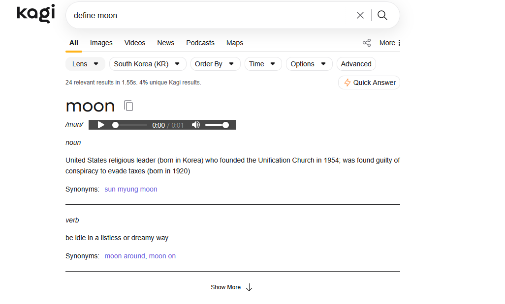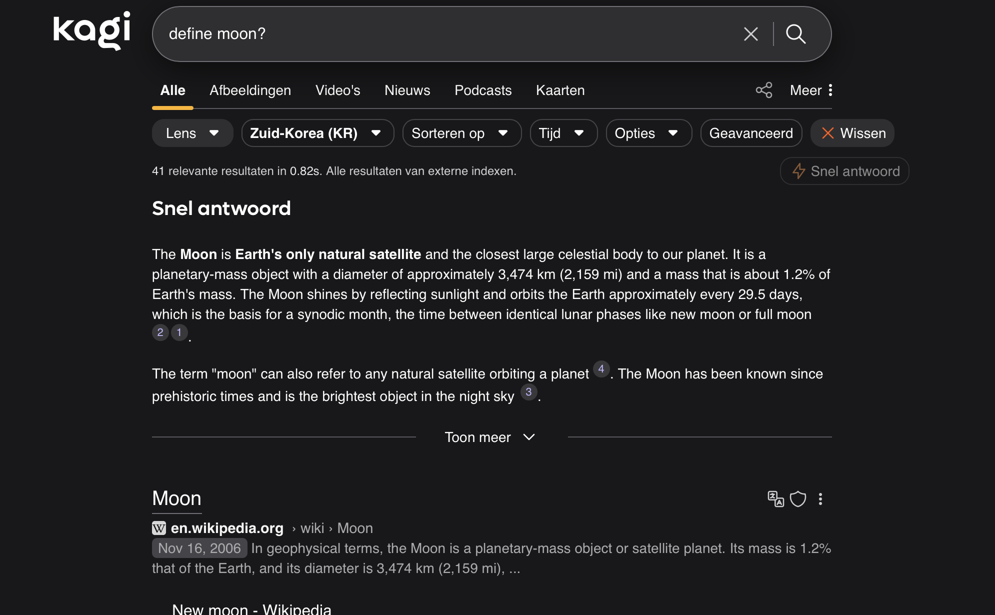 AmiasGrant Prompting Kagi to define "Moon" returns the following search result. Alternatively: https://kagi.com/search?q=define+moon&r=kr&sh=L9RFXUu1rzM6KZFYfkAv3g A definition that pertains to either our Moon or the concept of natural satellites as a whole.