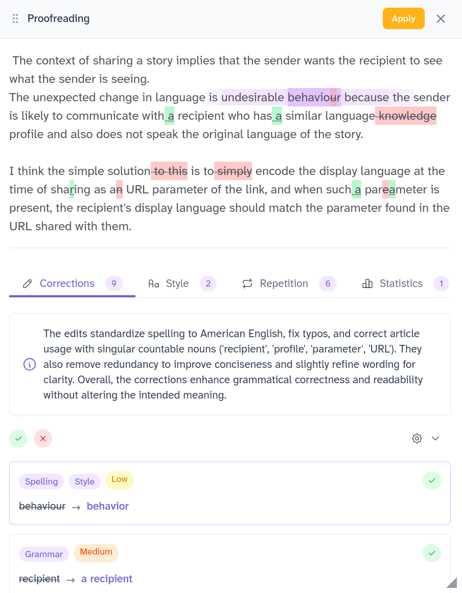 I have the Firefox Kagi Translate extension installed. Despite setting my target language in the Language section to Australian English, sometimes (but not always) when I select the proofread section the LLM assumes that the target language is English US. See the screenshot below: